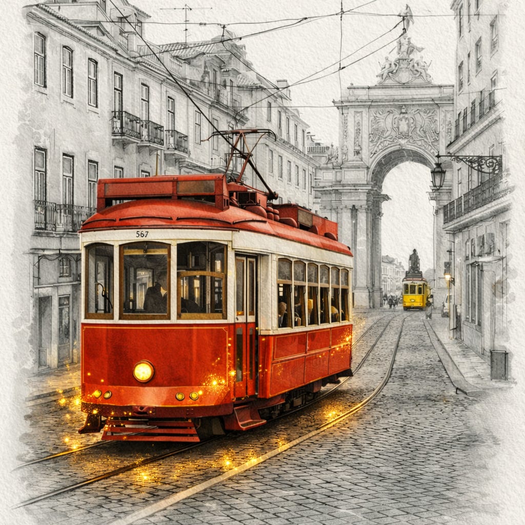 The street was all lines and shadow, soft graphite smudges pretending to be buildings, and then in the middle of it—too bright, almost stubborn—the red tram. Maybe it’s like this on purpose?